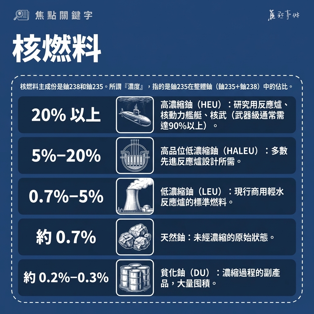 | 低濃縮鈾(LEU) | 0.7% 到 5% | 現行商用輕水反應爐的標準燃料。 |
