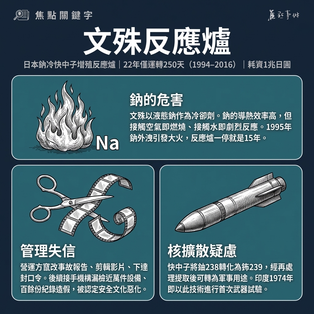 文殊使用液態鈉作為冷卻劑。鈉的導熱效率高、沸點高,但致命弱點是接觸空氣即燃燒、接觸水即爆炸。1995年,文殊併網發電僅4個月,冷卻管道中的溫度計套管因震動破裂,數百公斤液態鈉外洩並與空氣接觸,引發大火與腐蝕性毒氣,高溫甚至使室內鋼結構變形。營運方不僅試圖掩蓋事故規模,還竄改報告、剪輯影片,引發日本社會公憤。反應爐因此停機長達15年。