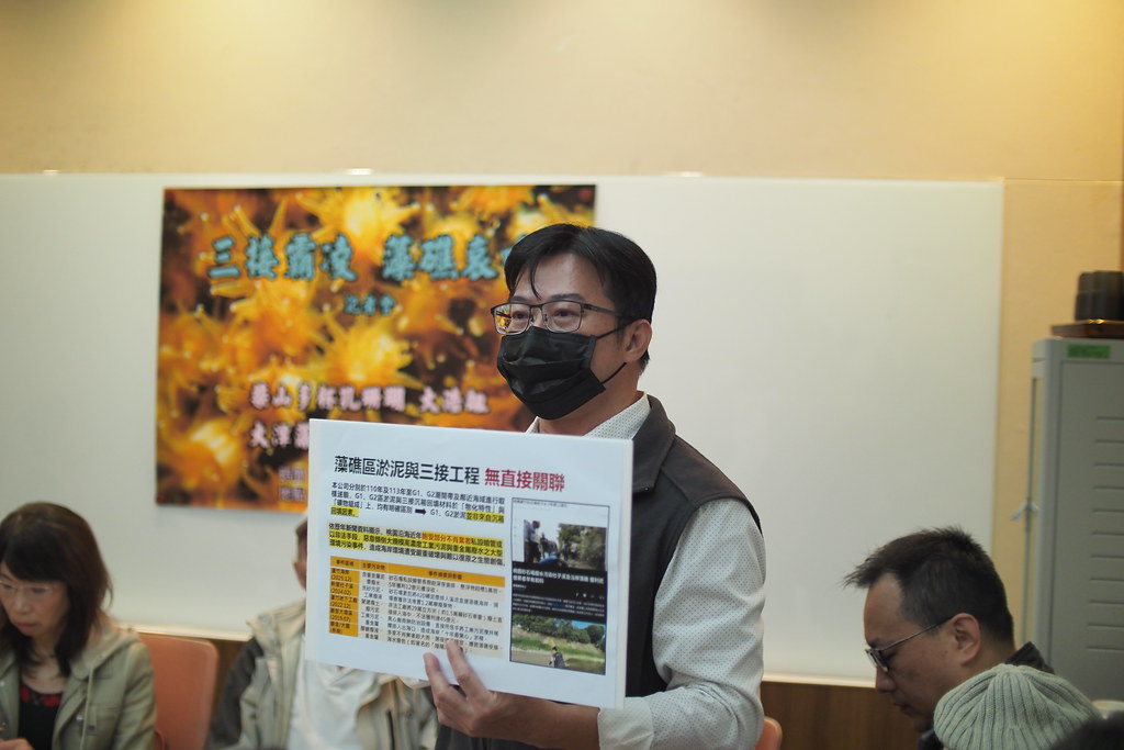 聯盟召集人潘忠政引用「觀塘工業區(港)生態保育執行委員會第 29 次會議」(2025/10/20)會議紀錄中,海保署代表的發言,指出保育類動物柴山多杯孔珊瑚「G1及G2區合併活群株數量在 66到118 株之間變動」、「但今年(2025)下半年G1區114年第3季未發現,第4季亦僅發現 17株」。同時也提出一張2025年11月的空拍圖,指出G1、G2區出現一大片沙洲。