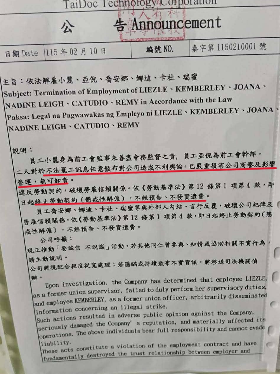 沒想到,勞動部「呼籲」完,泰博今天變本加厲,再開除了工會剩下的6名幹部,工會理監事盡數被開除。泰博公告聲稱,工會幹部散布不利公司輿論的訊息,損害公司商譽與營運,對工會幹部不經預告、不發資遣費的懲戒性解僱。