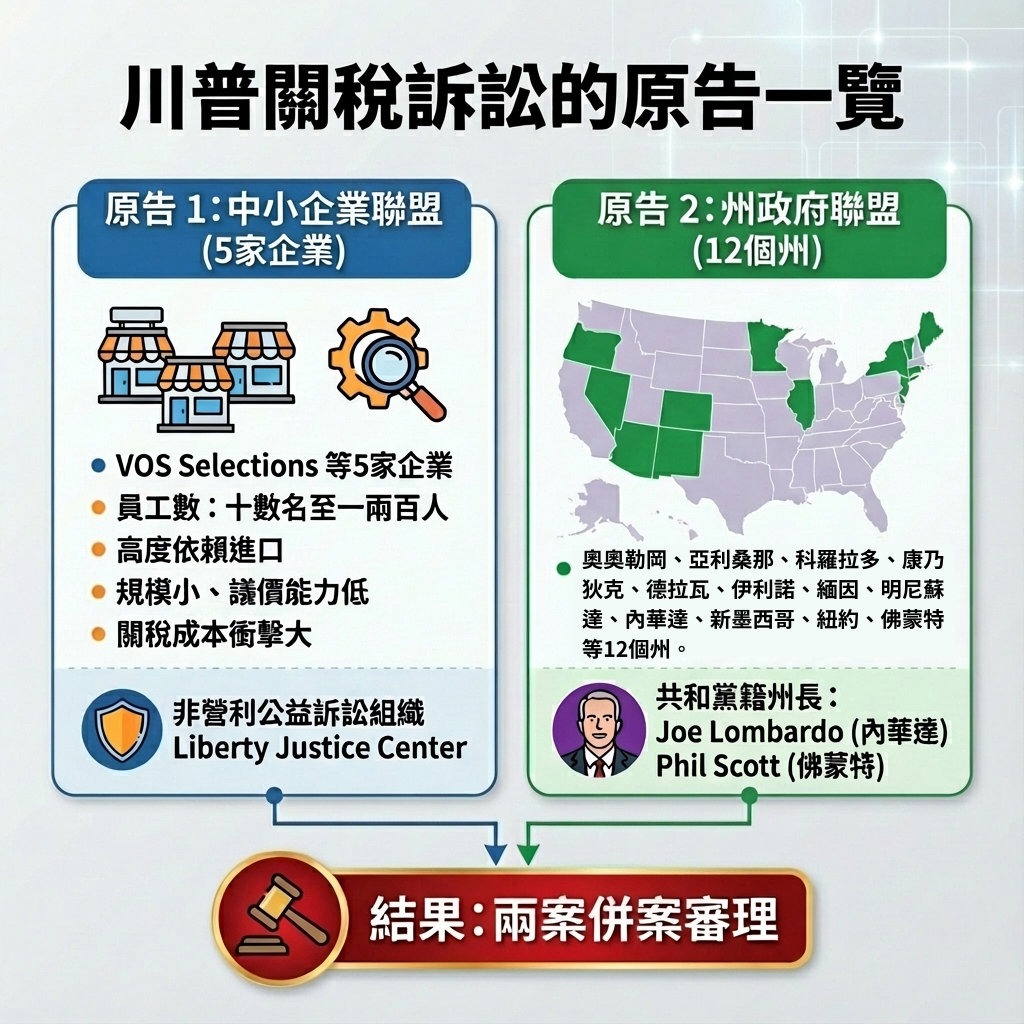 關於對等關稅的訴訟有好多個,不過,最主要進行的,是由5家美國中小企業及12個州註釋政府分別提起、美國國際貿易法院(Court of International Trade,CIT)將這兩起訴訟併案審理的(也有稱其為VOS Selections案)。